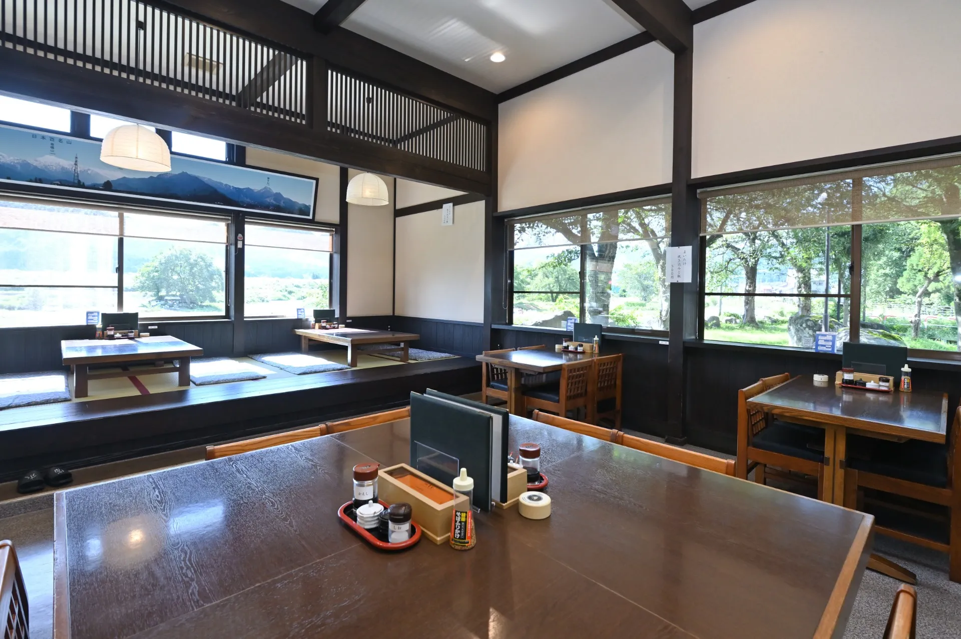 魚野川に面した立地から、窓越しに川や山の景色を眺められ、春夏秋冬それぞれの自然を感じながら食事ができます。そばは石臼で丁寧に挽き、自家製粉をブレンドして香りと風味を高めています。打つのは機械ですが、生麺の状態で持ち込み、店内で茹で上げるため、できたての味わいを提供できます。事業継承によって引き継いだ味を守りつつ、南魚沼の地で多くのお客様に親しまれています。